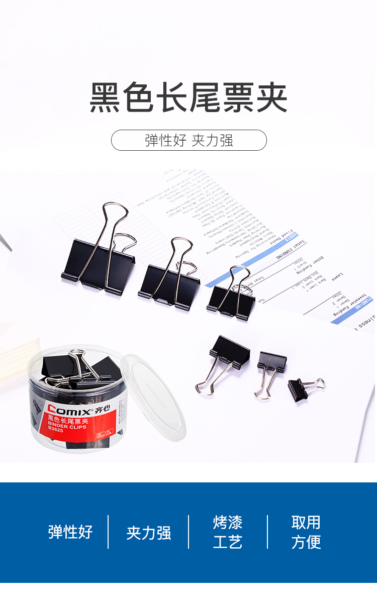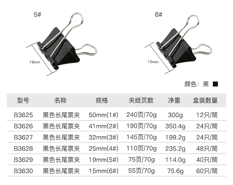 商品名称:齐心(Comix)长尾夹 B3625黑色金属 1#50mm 12只/筒 计价单位:筒
